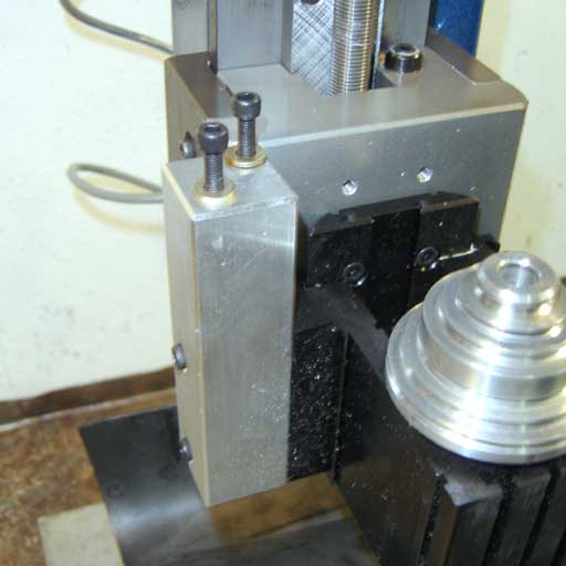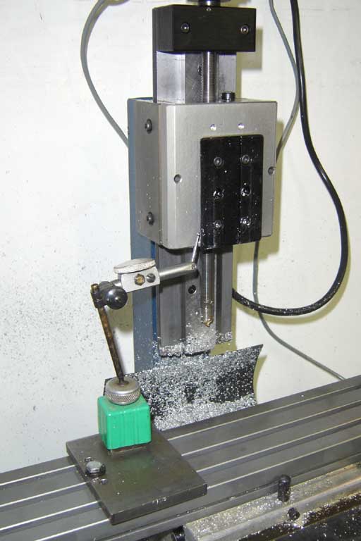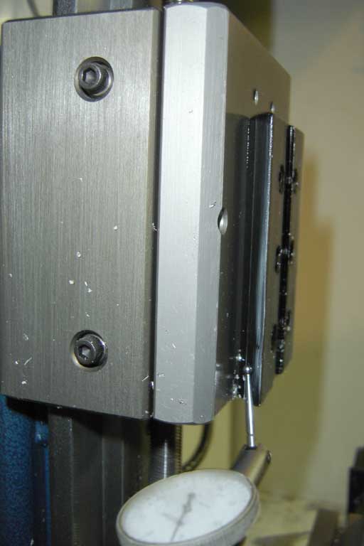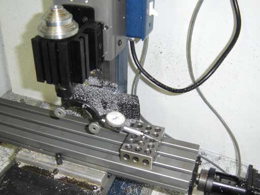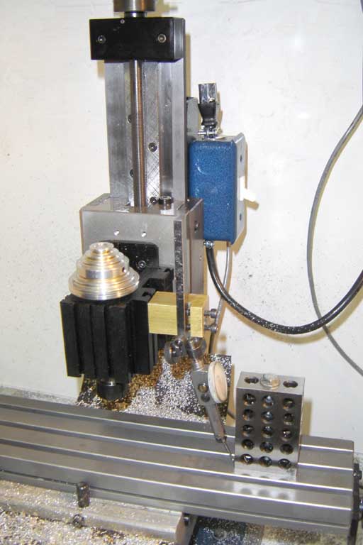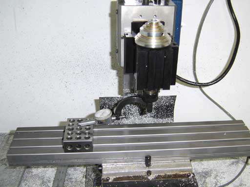 Once the z-axis slide is determined to run perpendicular to the table, you can check that the dovetail headstock mount in parallel to the travel of the slide by running the tip of an indicator along the dovetail. Slack all the dovetail mounting screws, but leave one slightly tight and adjust again by tapping with a soft hammer to bring into alignment. This can really make you crazy. But it will allow the greatest accuracy. But really, don't try this until you are comfortable adjusting things... |