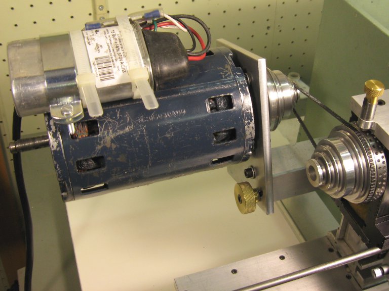 A motor that can be mounted right on the lathe headstock is a nice, compact approach common to many small lathes. I found such a motor at surplus, a Franklin 36-frame, 1/5 hp Model 1206030400. It turns out that this is exactly the same motor that Taig sells for its manual mill but I didn’t know that at the time. It also carried a Xerox part number so it was, at least for a time, an OEM for them. Franklin kindly provided a schematic showing the Xerox wiring with two capacitors and a starting relay. But it started and ran just fine as a single capacitor, PSC motor. I say ‘just fine’ but that’s not altogether true. This motor runs with perceptible electromagnetic vibration. The Xerox circuit may have smoothed this out or it may just have been damped by the mass of a heavy machine. But as a PSC, when attached directly to the Taig headstock as shown in Fig. 3.1, some kind of resilient mounting is definitely recommended. A simple solution uses small rubber grommets between the motor and mounting plate and is reasonably effective at isolating the lathe from this vibration. I used this layout briefly while developing my next system but never really liked it very much.